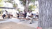Возбужденная студентка сосет огромный черный хуй публично на столе, а так же трахается в автобусе