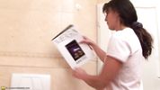 Мотоциклист в туалете круто выебал в рот очкастую зрелую тёлку